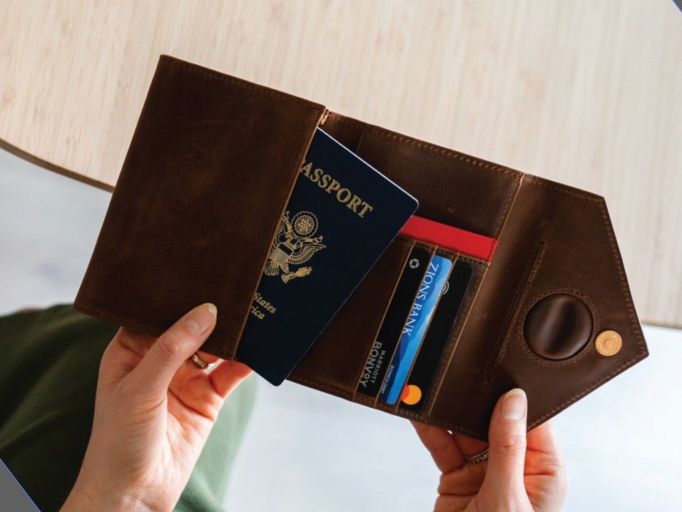 Hidden AirTag holder RFID blocking passport wallet made from real full grain leather